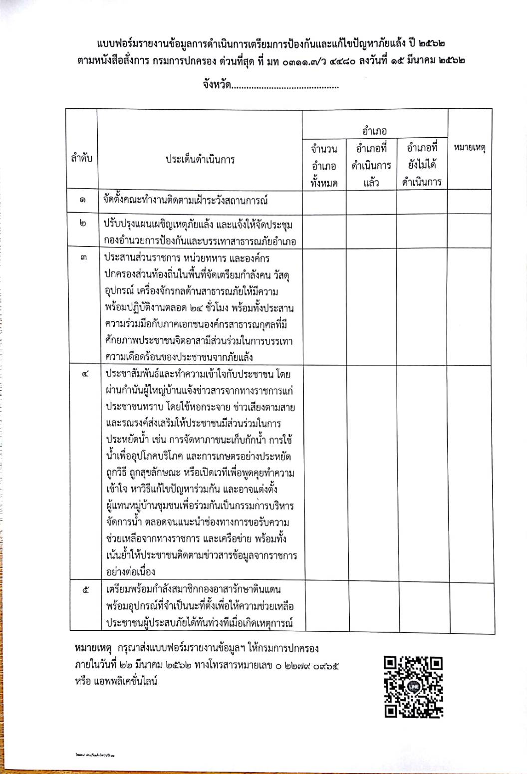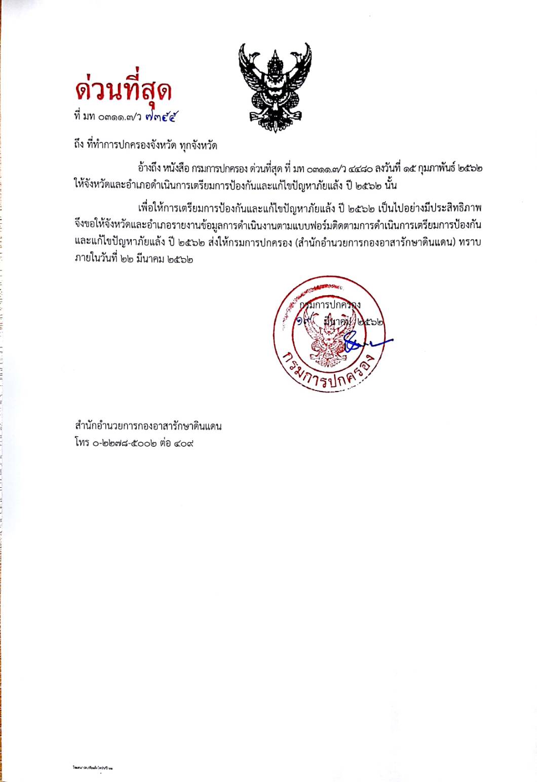 0311.3/;7355 การรายงานข้อมูลการดำเนินการเตรียมการป้องกันและแก้ไขปัญหาภัยแล้ง ปี 2562
