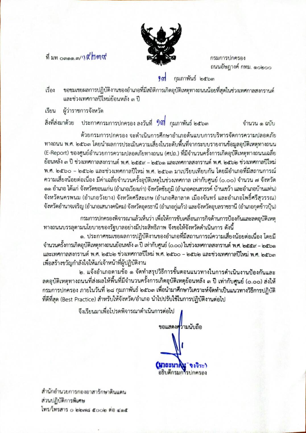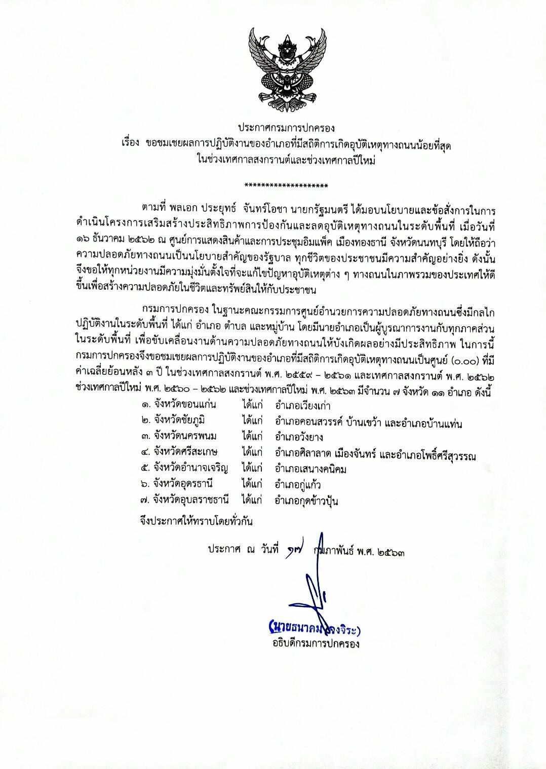 ขอชมเชยผลการปฏิบัติงานของอำเภอที่ม่ีสถิติการเกิดอุบัติเหตุทางถนนน้อยที่สุดในช่วงเทศกาลสงกรานต์และช่วงเทศกาลปีใหม่ย้อนหลัง 3 ปี