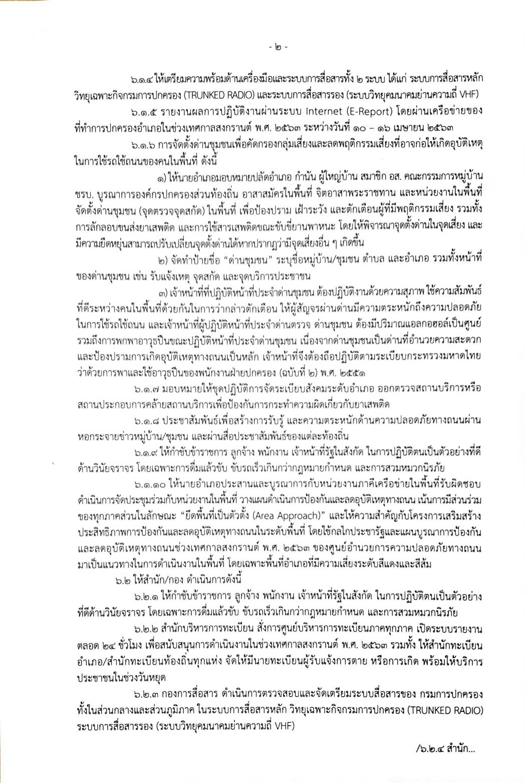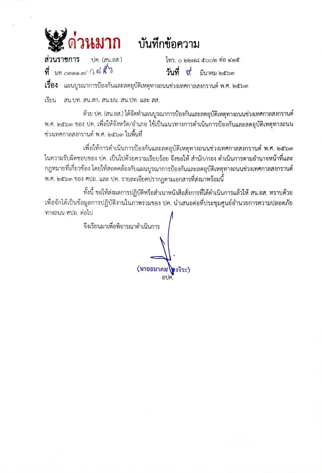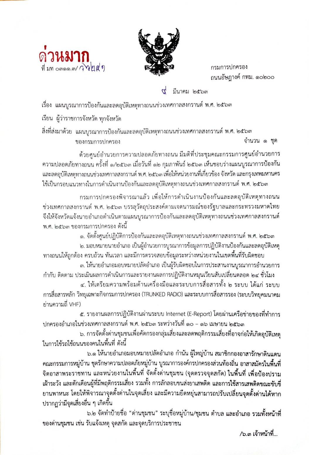 ที่ มท 0311.3/ว 6241 แผนบูรณาการป้องกันและลดอุบัติเหตุทางถนนช่วงเทศกาลสงกรานต์ พ.ศ. 2563 ของกรมการปกครอง
