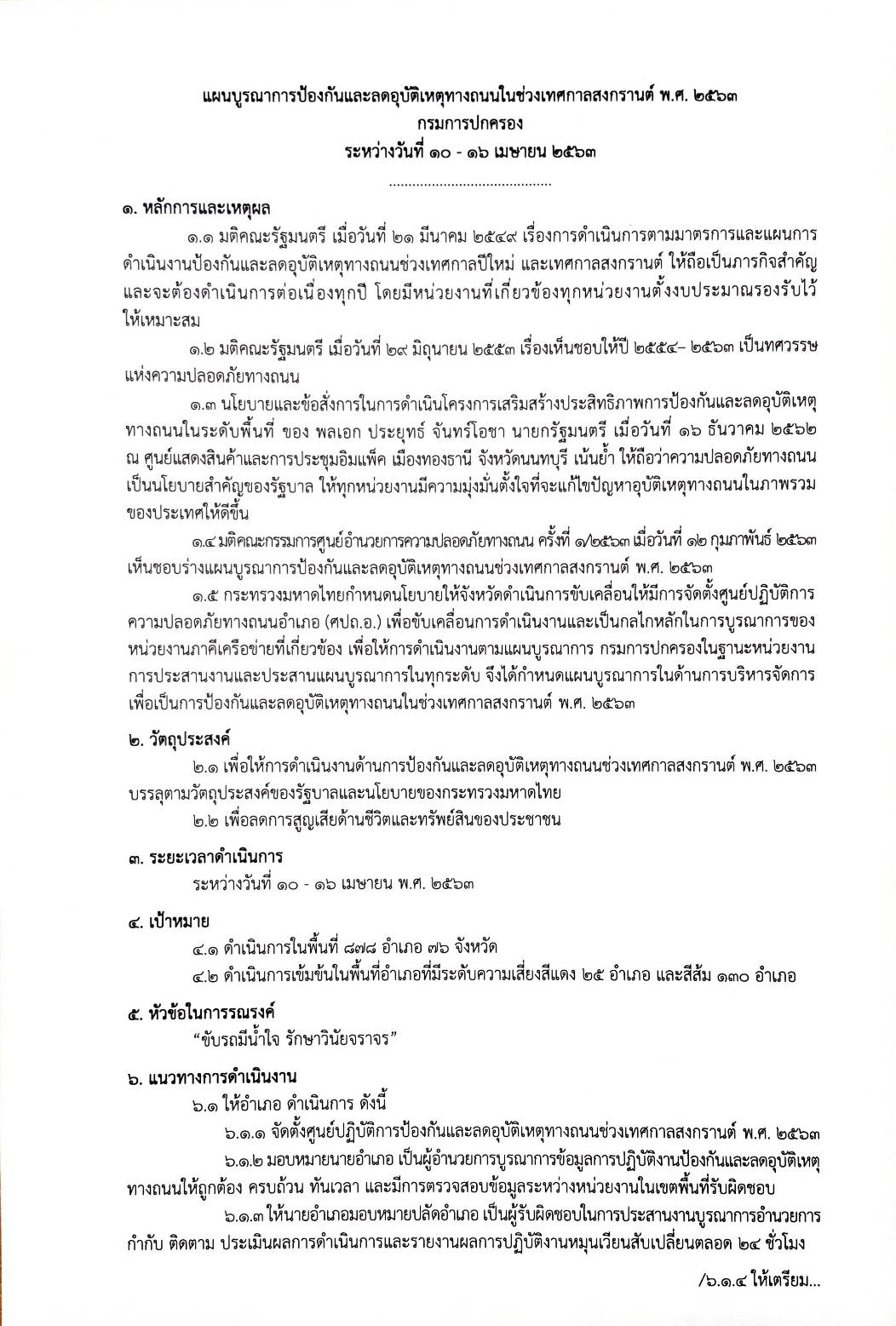 แผนบูรณาการป้องกันและลดอุบัติเหตุทางถนนช่วงเทศกาลสงกรานต์ พ.ศ. 2563 ของกรมการปกครอง