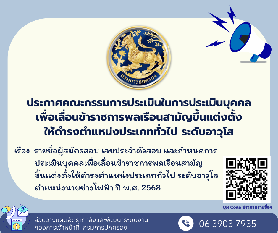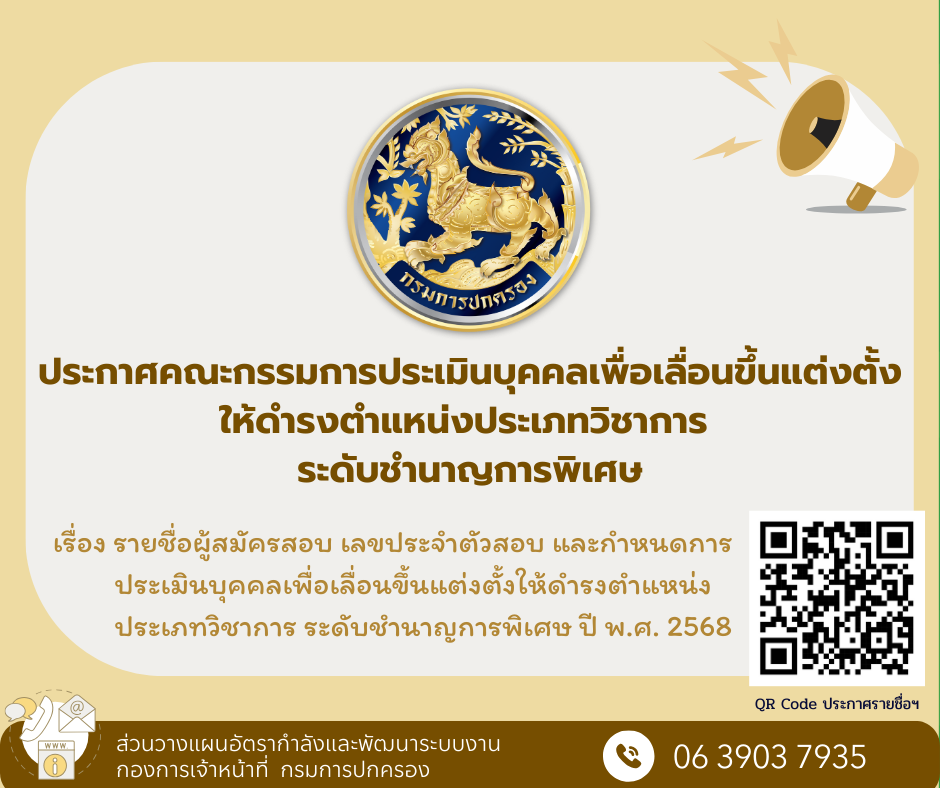 ประกาศรายชื่อผู้มีสิทธิเข้ารับการประเมินบุคคลเพื่อย้ายหรือเลื่อนขึ้นแต่งตั้งให้ดำรงตำแหน่งประเภทวิชาการ ระดับเชี่ยวชาญ กรมการปกครอง จำนวน 3 ตำแหน่ง ได้แก่ 1. ผู้เชี่ยวชาญเฉพาะด้านความมั่นคงภายใน (น ...