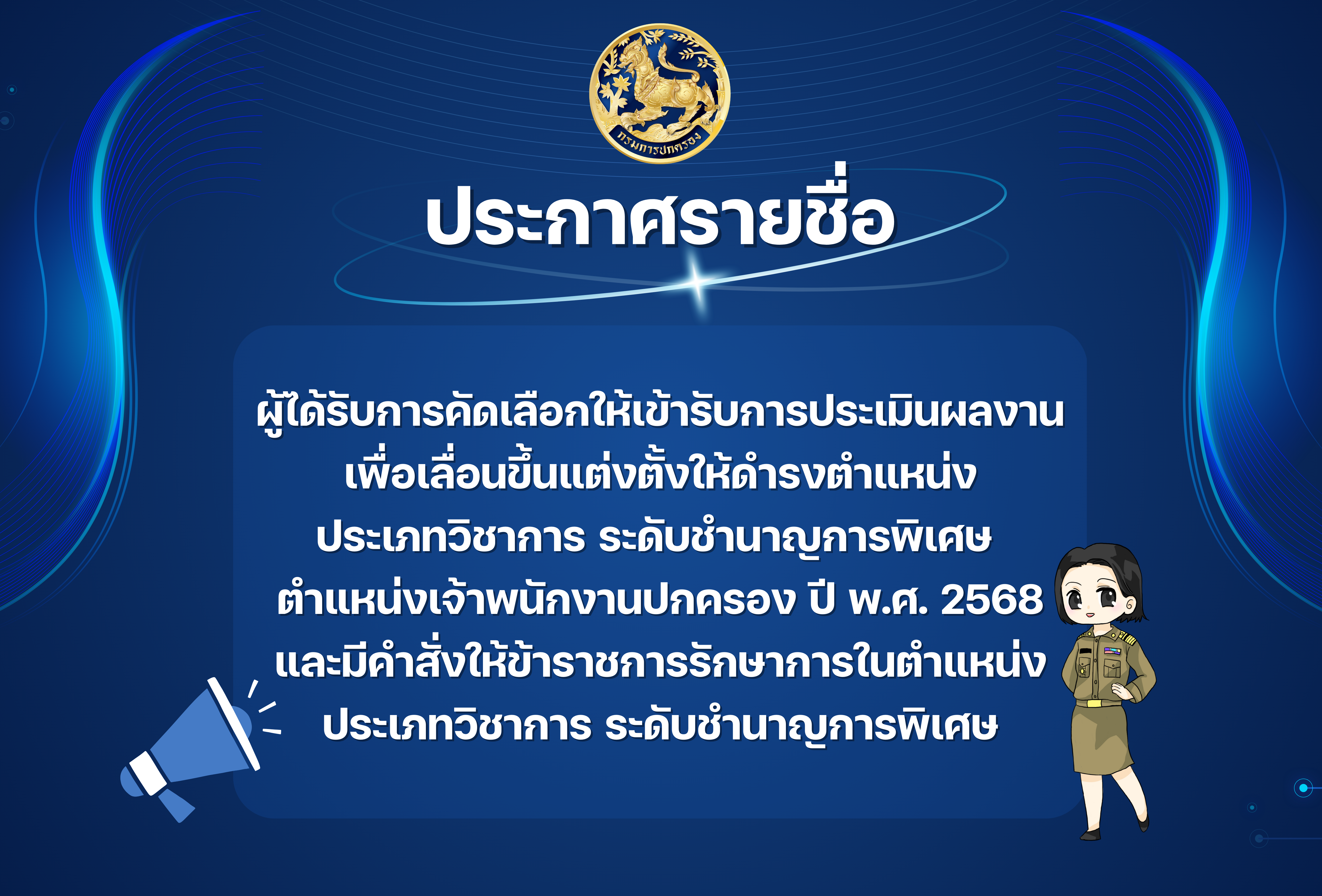 1. กรมการปกครอง มีประกาศรายชื่อผู้ได้รับการคัดเลือกให้เข้ารับการประเมินผลงานเพื่อเลื่อนขึ้นแต่งตั้งให้ดำรงตำแหน่งประเภทวิชาการ ระดับชำนาญการพิเศษ ตำแหน่งเจ้าพนักงานปกครอง ปี พ.ศ. 2568 จำนวน 7 ราย ทั้ง ...