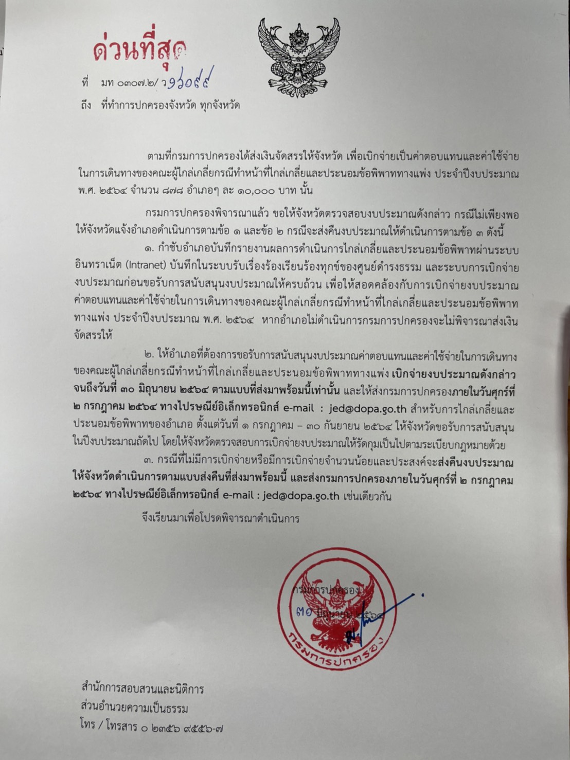 ที่ มท 0307.2/ว16099 ขอรับการสนับสนุนงบประมาณค่าตอบแทนและค่าใช้จ่ายในการดเินทางของคณะผู้ไกล่เกลี่ยกรณีทำหน้าที่ไกล่เกลี่ยและประนอมข้อพิพาททางแพ่ง (เพิ่มเติม) และส่งคืนงบประมาณ