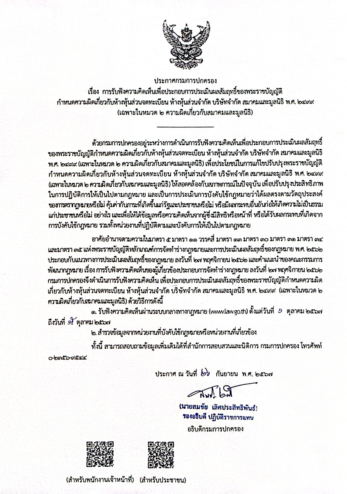 26ก.ย.2567 รับฟังความคิดเห็นเพื่อประกอบการประเมินผลสัมฤทธิ์พระราชบัญญัติกำหนดความผิดเกี่ยวกับห้างหุ้นส่วนจดทะเบียน ห้างหุ้นส่วนจำกัด บริษัทจำกัด สมาคมและมูลนิธิ พ.ศ. 2499 เฉพาะในหมวด2 ความผิดเกี่ยวกับสมาคมและมูลนิธิ