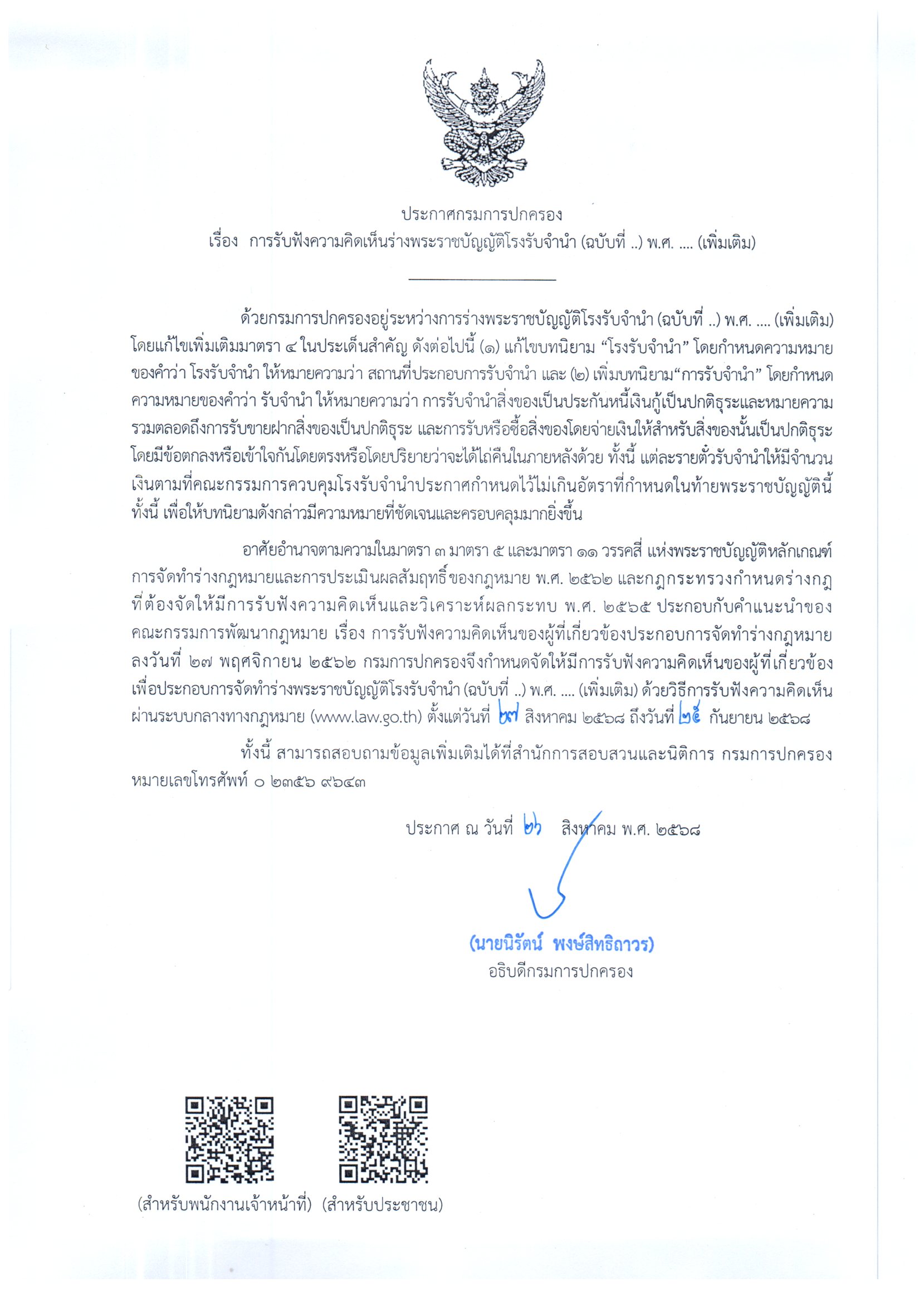 กรมการปกครองอยู่ระหว่างการร่างพระราชบัญญัติโรงรับจำนำ (ฉบับที่ ..) พ.ศ. .... (เพิ่มเติม) ผ่านระบบกลางทางกฎหมาย(www.law.go.th) ตั้งแต่วันที่ 27 สิงหาคม 2568 ถึงวันที่ 25 กันยายน 2568 โดยแก้ไขเพิ่มเติมมาตรา ๔ ในประเด็นสำคัญ ดังต่อไปนี้