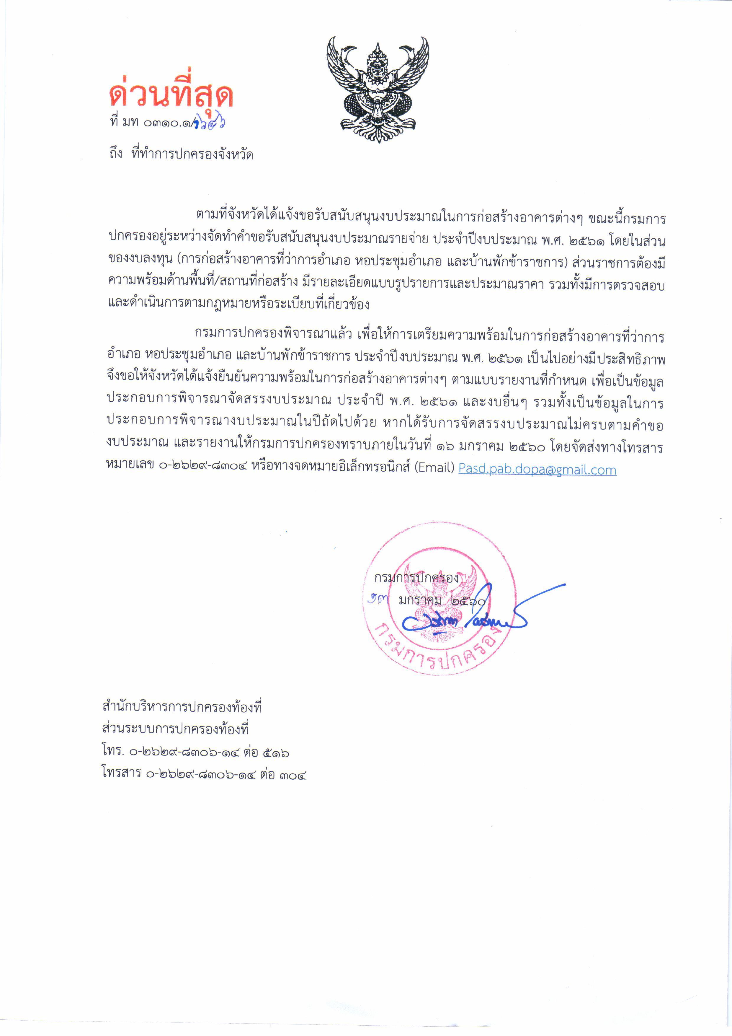 มท 0310.1/ว656 เตรียมความพร้อมการก่อสร้างอาคารที่ว่าการอำเภอ หอประชุมอำเภอ และบ้านพักข้าราชการ ประจำปีงบประมาณ พ.ศ. 2561