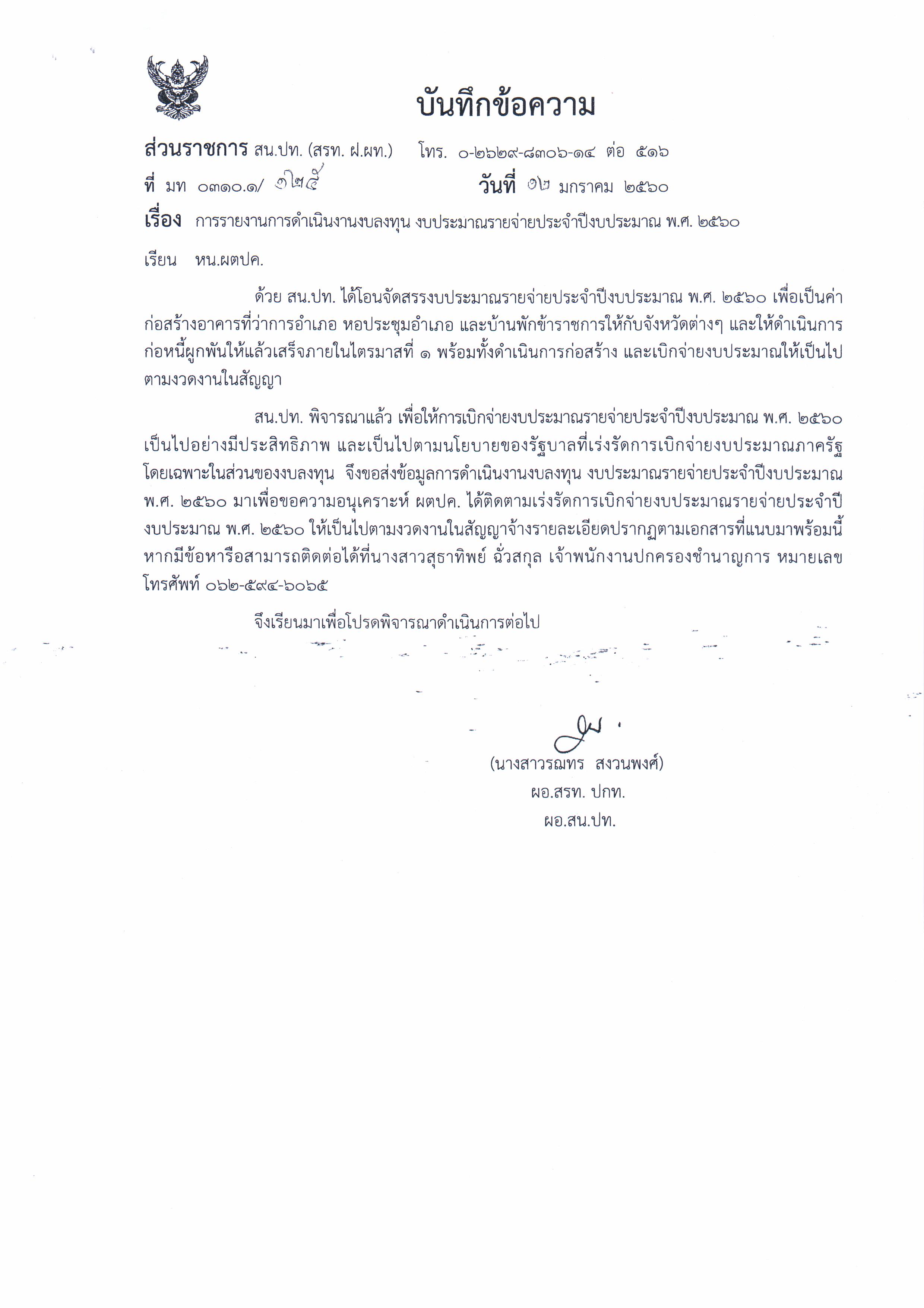 มท. 0310.1/125 การรายงานการดำเนินงานงบลงทุน งบประมาณรายจ่ายประจำปีงบประมาณ พ.ศ. 2560