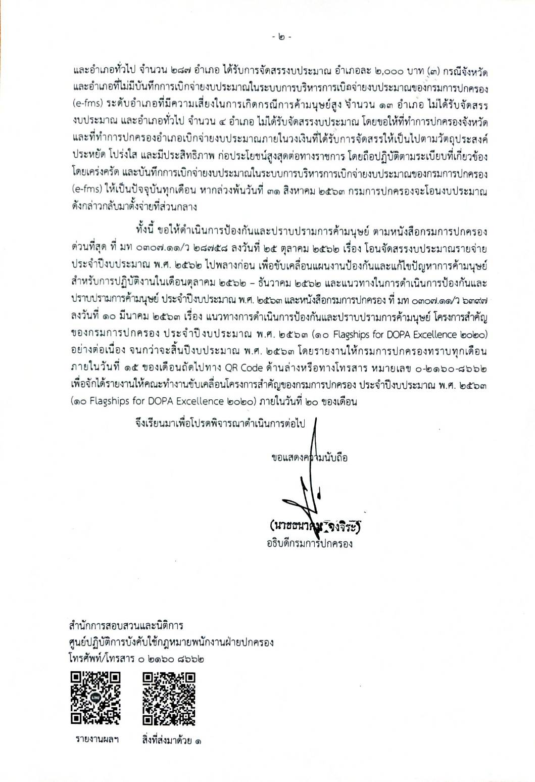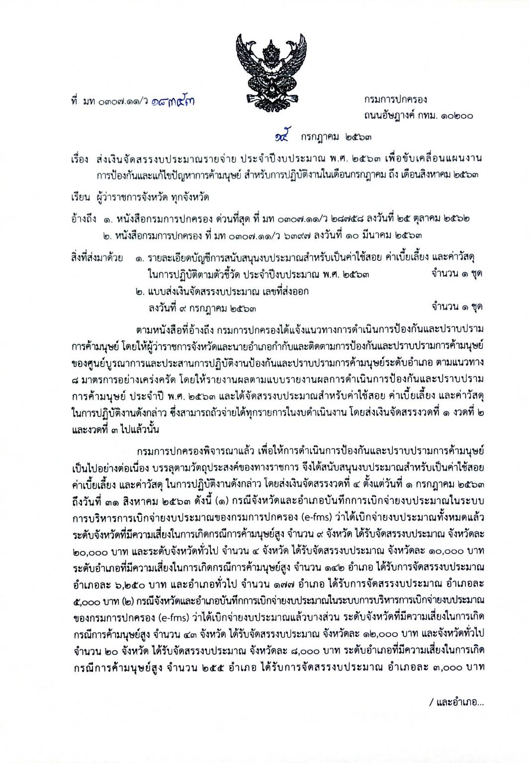 มท 0307.11_ว 18353 ลว 15 ก.ค. 63 สน.สก. ส่งเงินจัดสรรงบประมาณรายจ่าย ประจำปีงบประมาณ พ.ศ. 2563 เพื่อขับเคลื่อนแผนงานการป้องกันและแก้ไขปัญหาการค้ามนุษย์ สำหรับปฏิบัติงานในเดือนกรกฎาคม ถึงเดือนสิงหาคม 2563