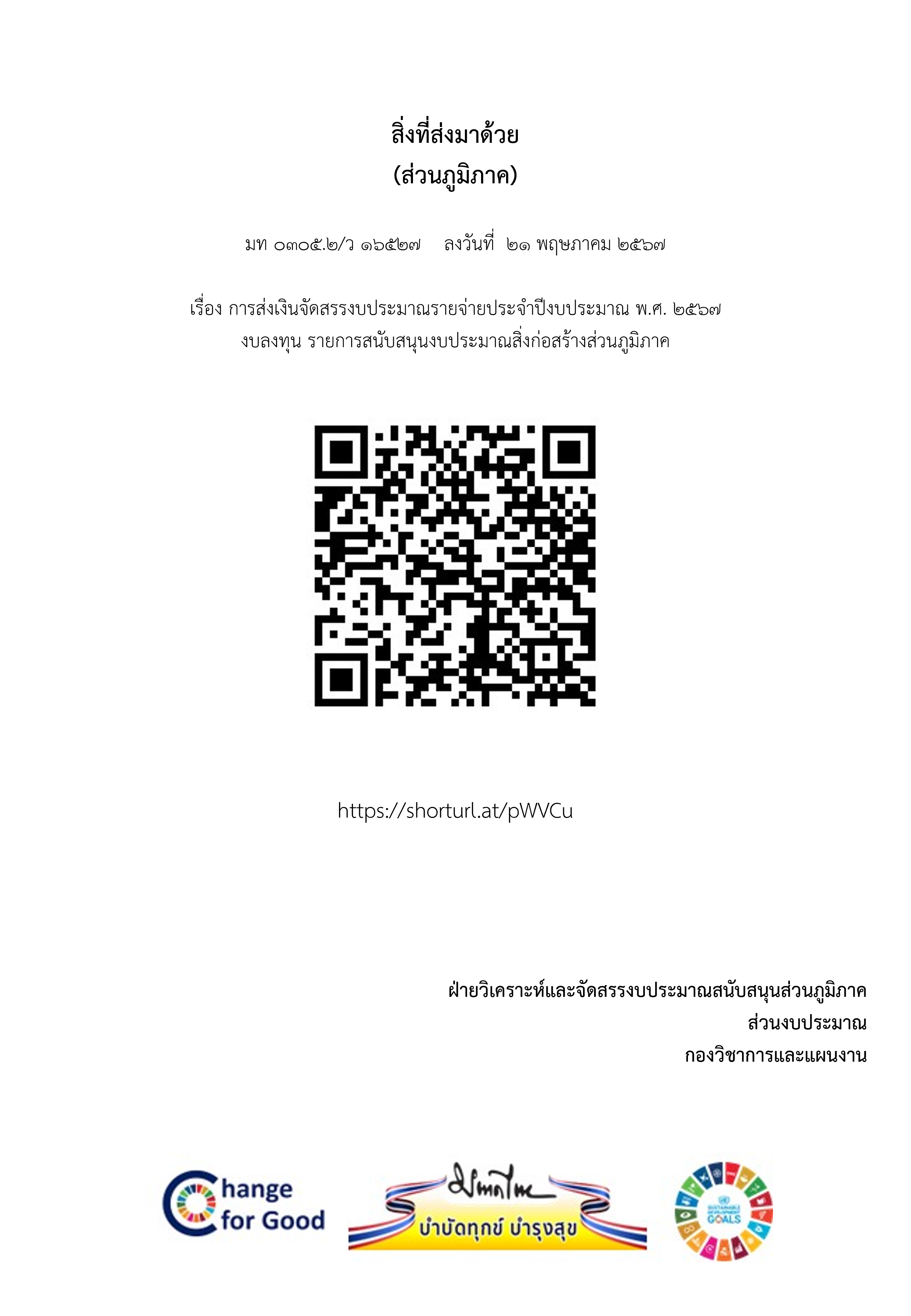 ส่งเงินจัดสรร งบประมาณรายจ่าย ประจำปีงบประมาณ พ.ศ.2567 งบลงทุน รายการสนับสนุนงบประมาณสิ่งก่อสร้างส่วนภูมิภาค