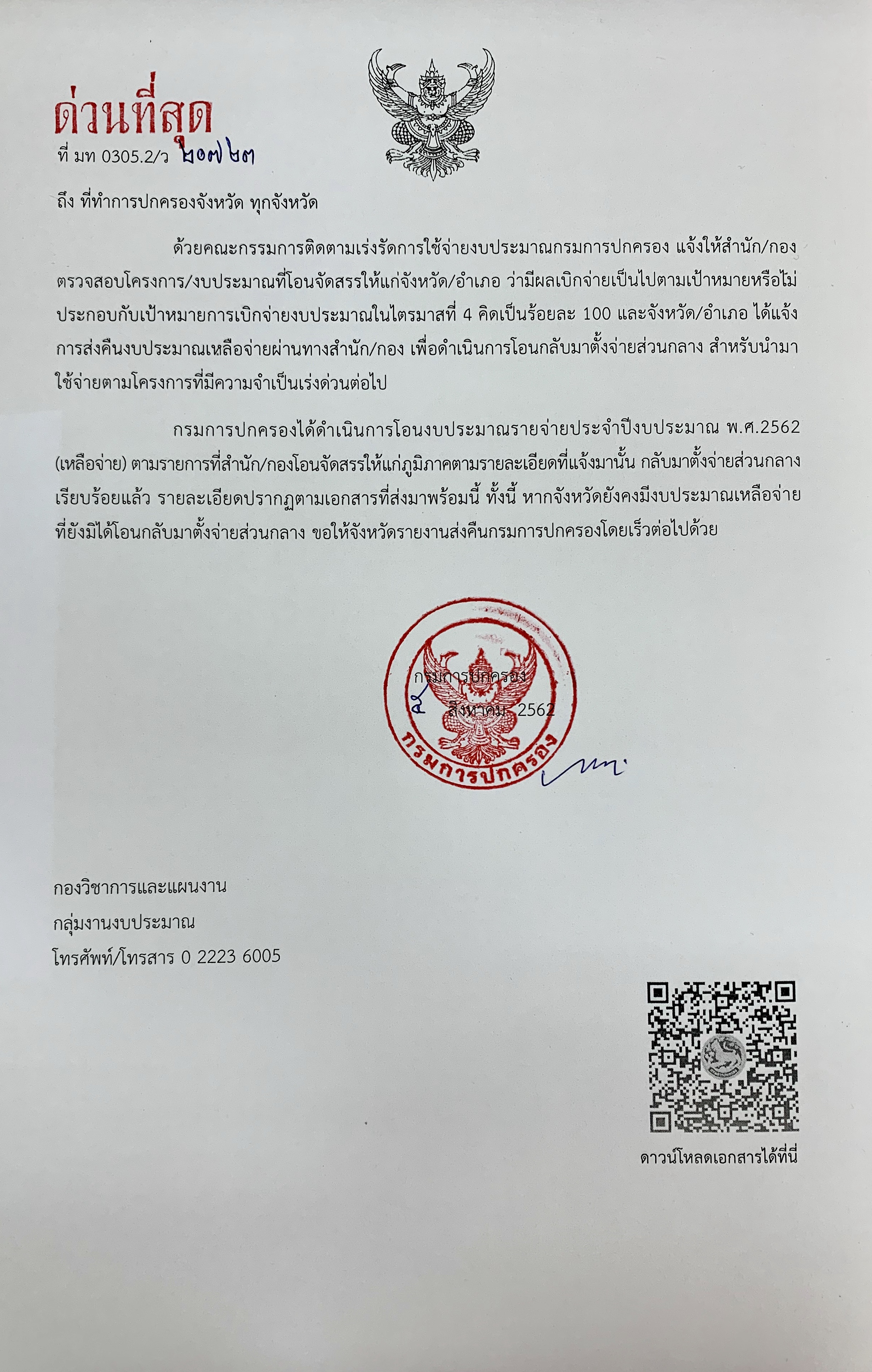 ที่ มท 0305.2/ว 20723 วช. (กง.งป.) แจ้ง งป. รายการโอนงบประมาณรายจ่ายประจำปี พ.ศ. 2562 จากที่ทำการปกครองจังหวัด/อำเภอ กลับมาตั้งจ่ายส่วนกลาง